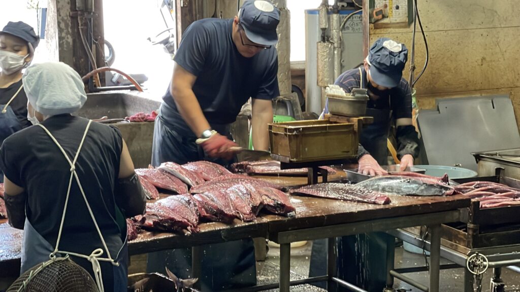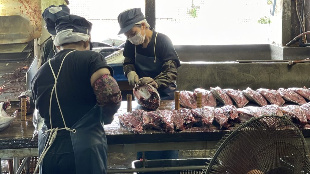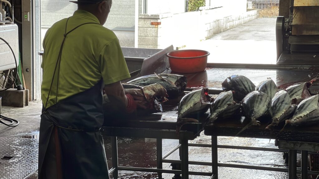 工場見学に伺うとすでに作業は始まっており、昨晩から解凍されたかつおが卓上に並び頭、内臓を取り除き鰹節の形にカットされていきます。