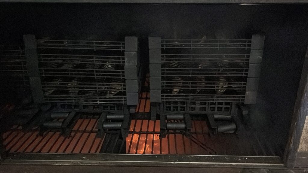 カゴに並べられ、茹でた後、燻製と乾燥を同時に行う「燻乾(くんかん)」作業に移ります。