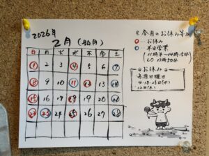 2 042026 2026年 2月のお休み 2月のお休み 日曜・4・12・18・25 土曜・祝日はお昼のみの営業です 今月も皆様のご来店をお待ちしております。 Tweet Share この記事のタイトルとURLをコピーする 2026年1月のお休み 前の記事